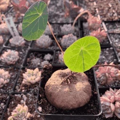 Unique Appearance: Features a striking round tuber (caudex) with slender stems and vibrant green heart-shaped leaves.